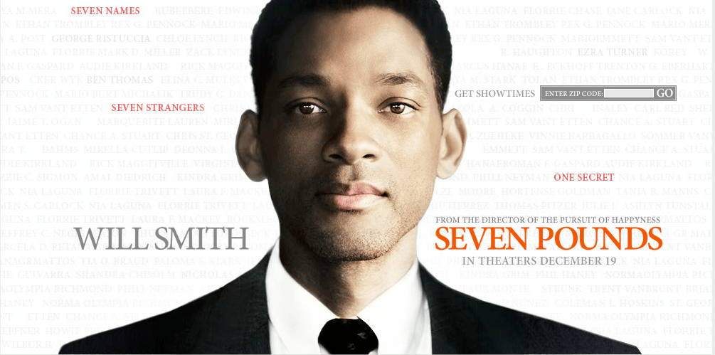 這是一部2008年的電影,男主角是一位追逐美國夢的聰明麻省理工男,在一次開著豪車載著漂亮未婚妻的路上看了一下手機上工作傳來的訊息,因而不留神發生死亡對撞車禍,最終導致了包含自己未婚妻以及對向來車全數死亡的慘劇,這個慘劇讓男主角完全背負著歉疚的十字架一直苟活著,直到自己的親弟弟因為一次肺癌需要器官捐贈,於是他捐出了自己的一個肺因而得到啟發,開始想到透過捐贈幫助七個人來「還命」。