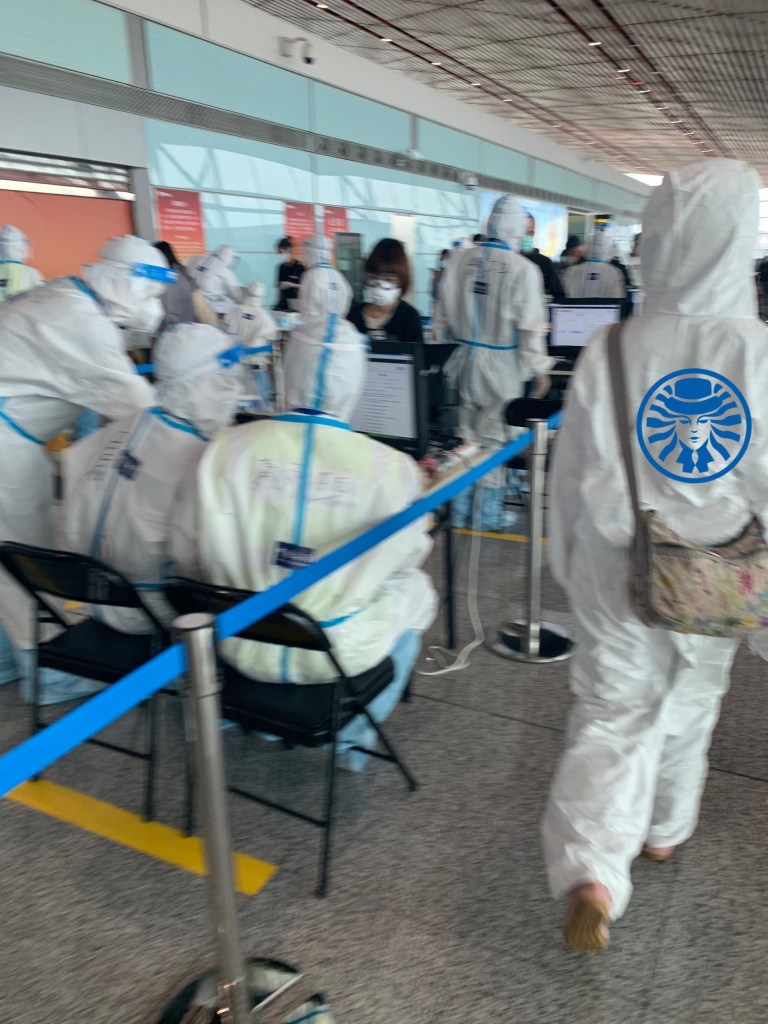 一下飛機我就驚呆了,一堆像是生化電影裡面出現的隔離裝迎接著大家