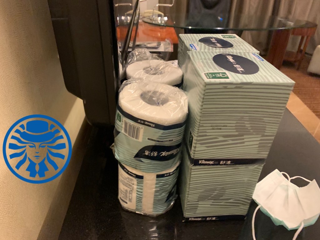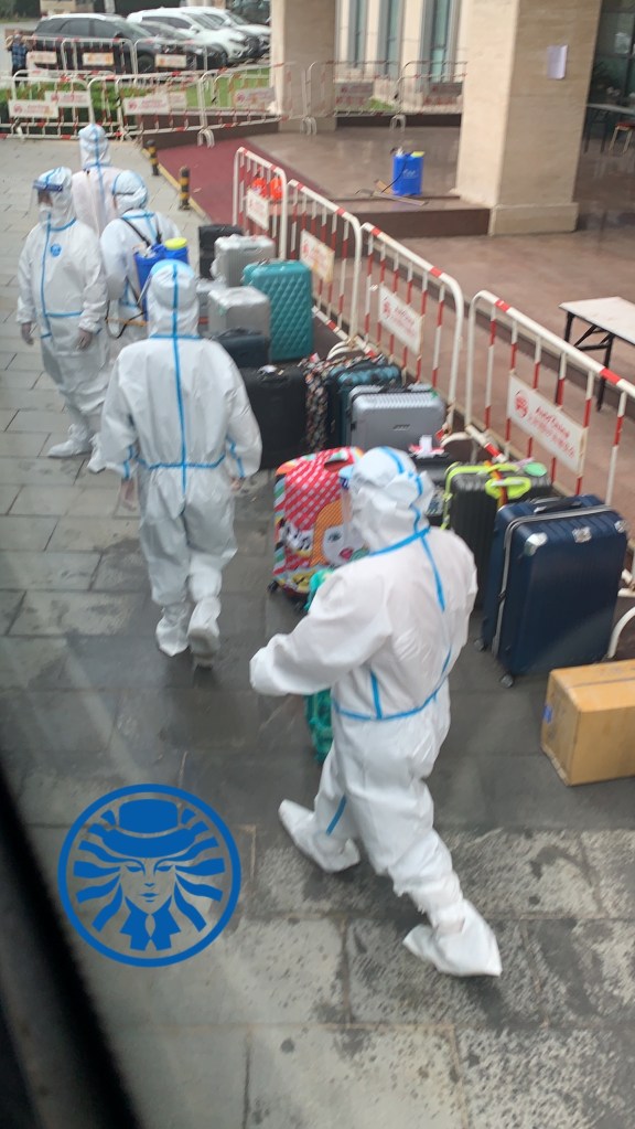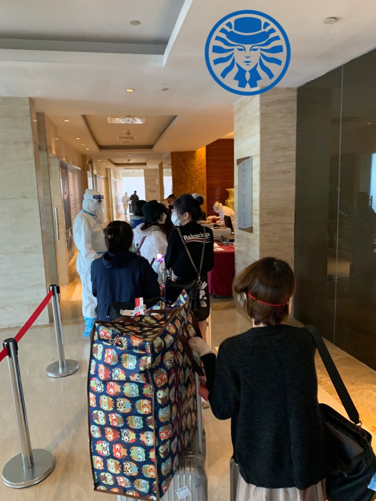 最後答案揭曉,被入住到北京臨空皇冠假日酒店,到了防疫旅館之後,辛苦的飯店工作人員已經穿著隔離服在迎接我們了,第一件事是先把我們的行李拿出來消毒。
