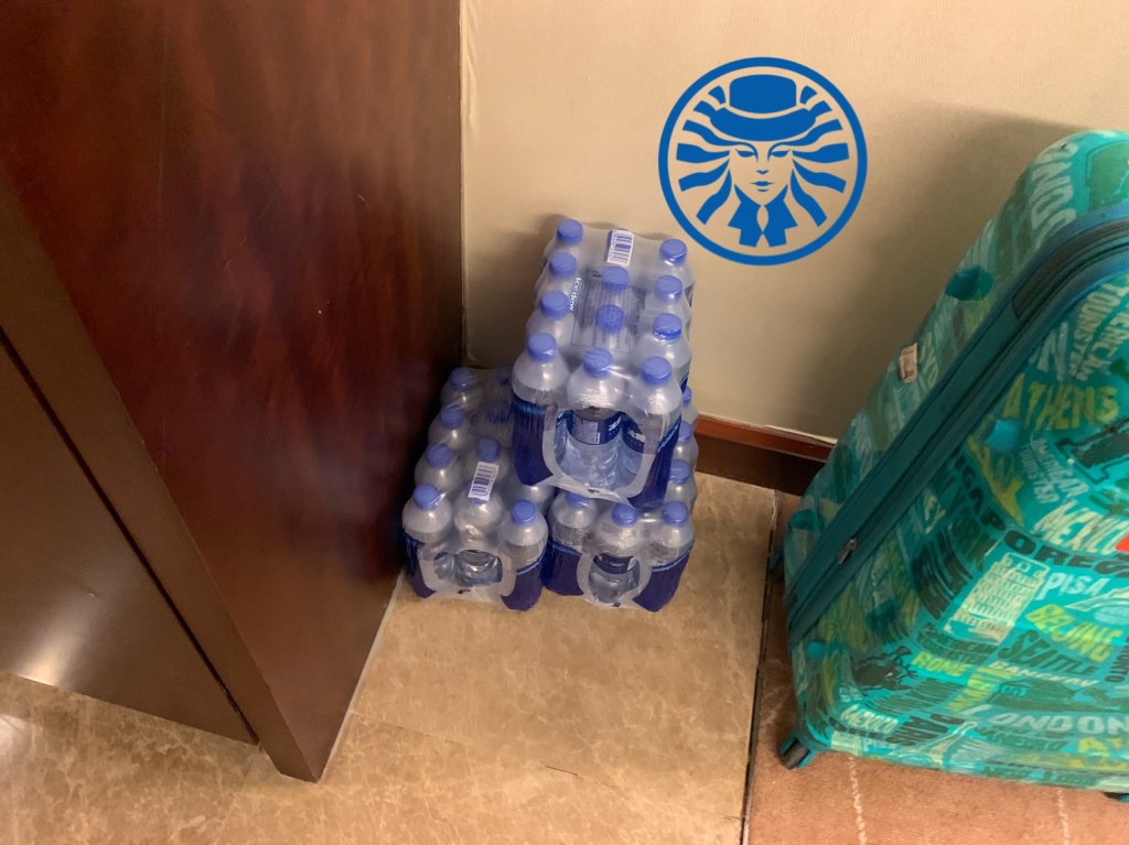 廁所也很大,有大浴缸也有淋浴間,接下來就是資源分配,比如水有36瓶,多要的要加錢,所以所以平均一天能喝2.57瓶。