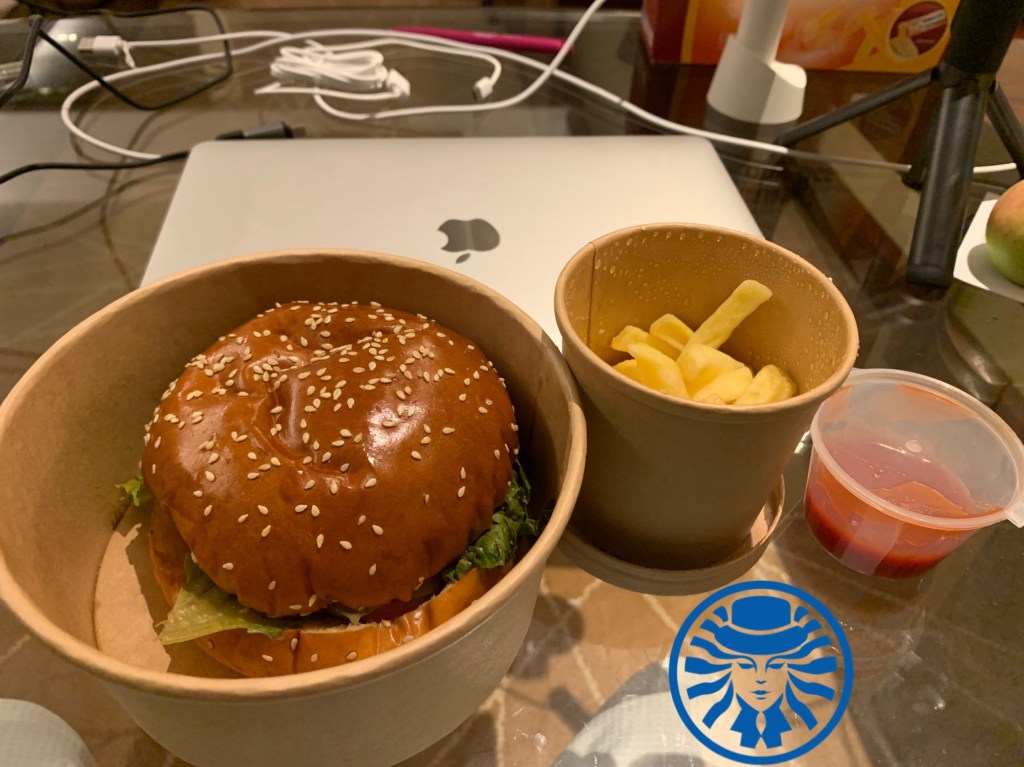 午餐花了我88元人民幣,得到一碗超大的漢堡跟一碗薯條,薯條好像清蒸的一樣軟軟的好難吃,漢堡很大而且肉排很厚很好吃。
