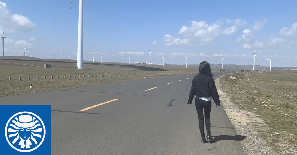 隔天一早,我們點了當地的羊肉燒賣帶上車(很奇怪燒賣上面的皮不會蒸熟還帶著白白的粉),我們一路往東北開了 100公里,前往黃花溝風景區,開始進入大草原以後就像進入許多美國中部人煙稀少的州一樣,都是一整片看不到底的風力發電大風扇。
