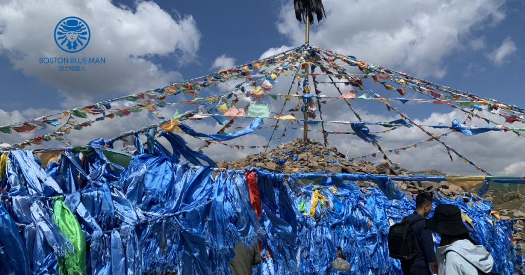 透過黃花溝地質博物館的入口進入園區後,沿著步道前行第一站就是一座藏傳佛教的夏爾其其格敖包,藍人團隊依據蒙古人傳統習俗順時針繞行了敖包三圈並許下願望。