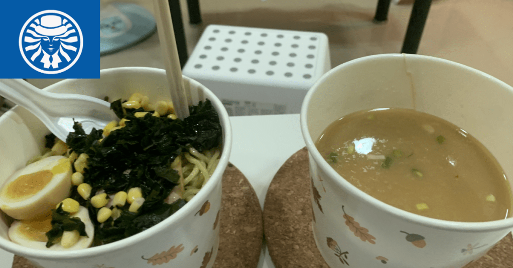 然後老闆很貼心的幫我湯麵分離,我試圖把面撈到湯碗裡,但是麵都因為冷掉已經變成一球了,整個黏很緊拔不出來,就算我動作很慢,麵上面的玉米海苔還是掉落滿地…