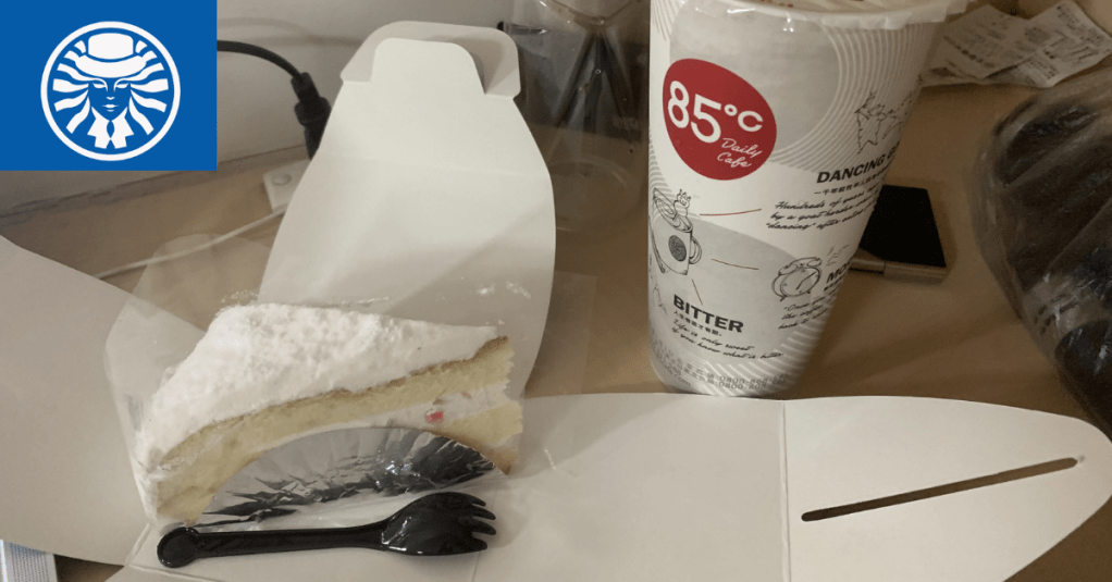 因為早餐太晚吃,所以午餐吃不下沒吃,以至於下午飢餓難耐,只好請熊貓帶來一個波士頓草莓蛋糕,以及一杯黑岩咖啡,費用115元。