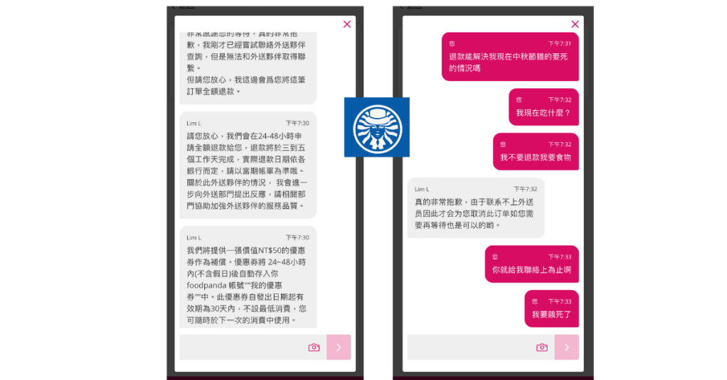 沒想到平台首先丟了三責模板,然後告訴我他們找不到外送員,所以給我退費,我真的氣炸了!!!!!台灣人有這麼賤嗎?為什麼要這樣被對待??一家宣稱做食物配送的公司,我用了十天,出錯率高得驚人,跟客服反映總是只能得到制式回答、退費,頂多就是給你30元或者50元的抵用券,如此高傲、如此垃圾的配送公司,竟然就是台灣的食物配送龍頭企業!!簡直不可意思義,台灣人有這麼好欺負嗎?如果無法提高穩定性、可靠性,憑什麼一直拓展配送地區、增加配送服務,你連湯都送不好就算了,現在連餐都送不到,現在還要送菜??而我們的消基會在哪裏?台灣真可憐。