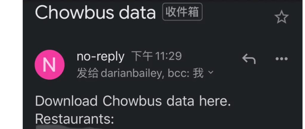然後,就在十一點半,我的郵箱突然收到了一封奇怪的郵件,標題叫做「Chowbus data」,是 no-reply@chowbus.com 信箱寄來的。