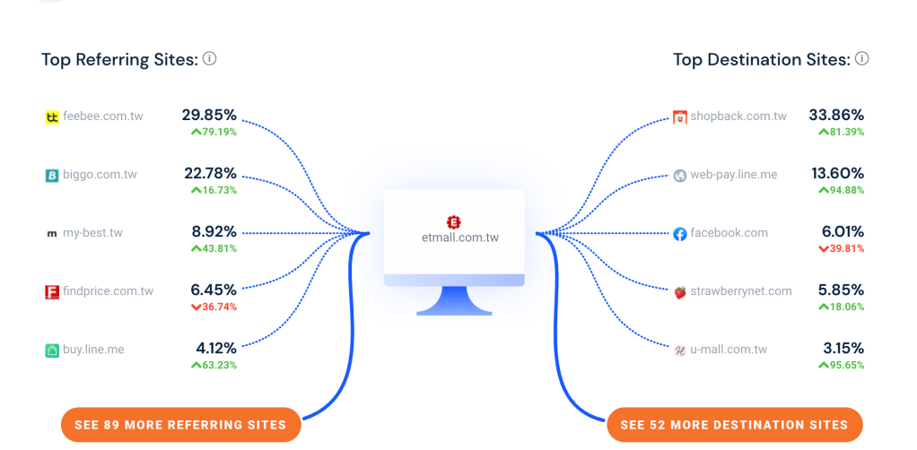 首先我先做了基本的關於東森購物這個網站的流量來源分析,發現東森收購的港商化妝品電商草莓網只帶了 5.85%流量,但是東森許多直銷人員總是誇大這間公司及旗下的各個品牌,結果實質上東森購物網站的流量的主要來源還是來自於返現比價網站如 Shopback, 飛比價格, BigGo…