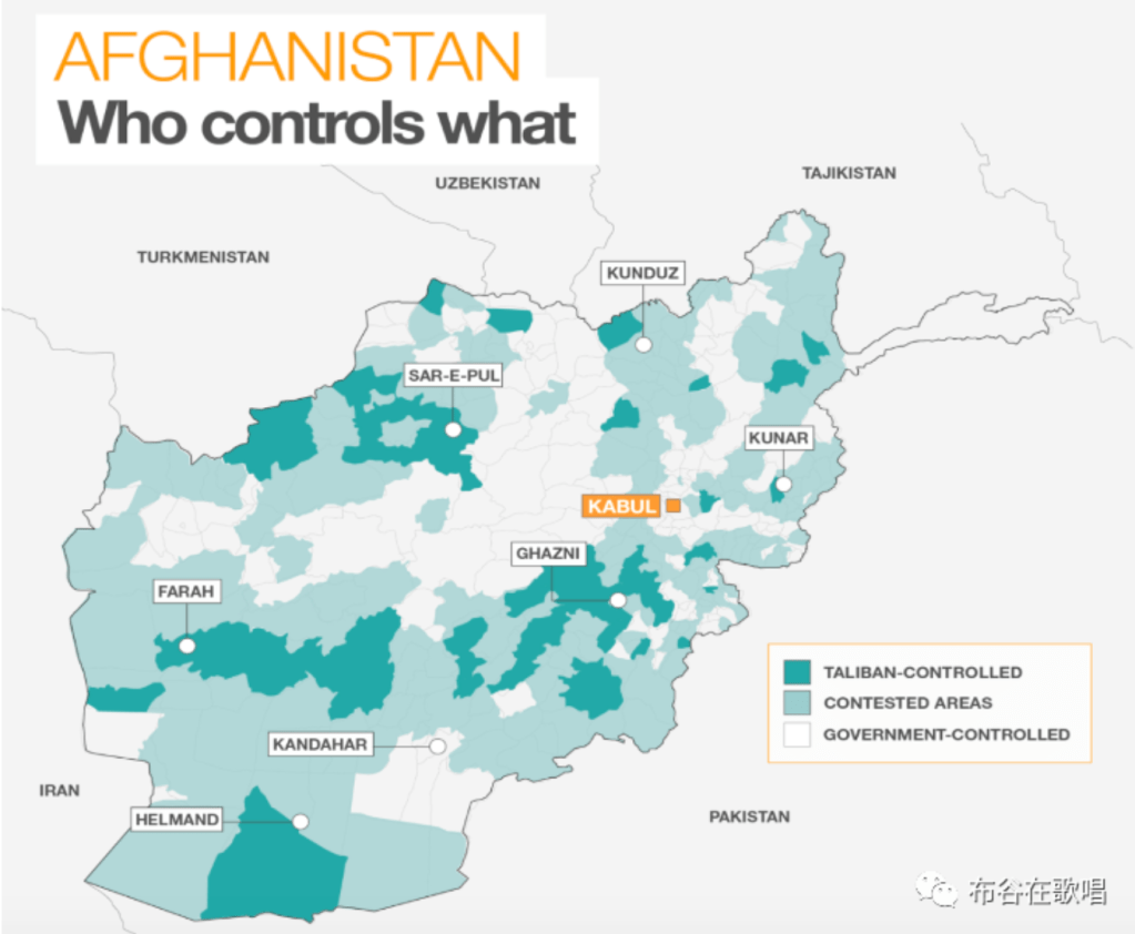 2001年美軍入侵,一度被視為阿富汗的轉機。然而,正如20年前的蘇聯,美軍也逐漸發現,自己踏入了一個難以醒來的噩夢。2001年,全世界都認為美軍已經趕跑了塔利班,但是很快,塔利班捲土重來,到2019年,政府只控制著35%的領土,塔利班佔領了阿富汗13%的土地,而另外一半的領土上雙方展開拉鋸戰。關於這一點,大家可以參考文稿中的圖片(圖3)。