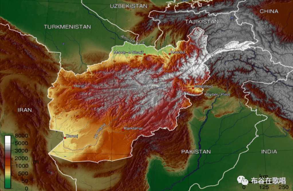 首先是地理條件。大家不要覺得,自然和政治沒有什麼關係,關係非常之大。在比較政治學的內戰研究中,許多研究都會把「多山與否」作為一個變量來分析。為什麼?因為多山意味著政府觸角的限度,也意味著叛軍容易找到藏身之所。阿富汗就是一個多山的國家。大家可以看看解說詞中的阿富汗地勢圖(圖4圖5)。可以看出,這是一個幾乎完全被山地覆蓋的國家,人類只是聚居在山間的峽谷地帶而已。可以想象,在這種地形地勢中,在交通通訊不發達的時代,不同社區之間交往是非常困難的,建立大一統的中央政府更是困難重重,因為這種地貌,出門買個菜看上去都像是去西天取經一樣困難。