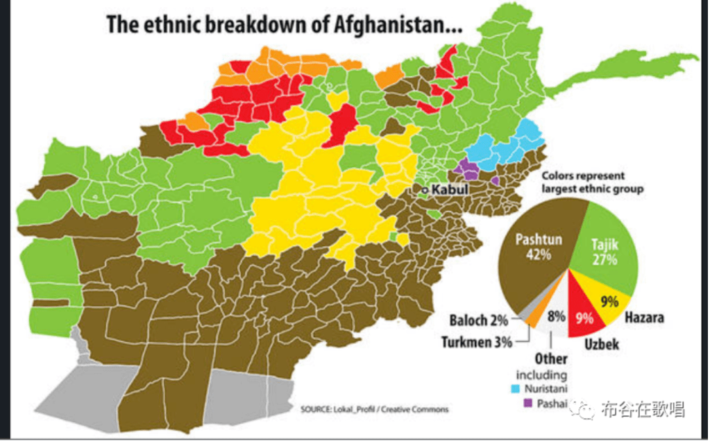 阿富汗是個道地的多民族國家。文稿中可以看到阿富汗大致的族群分布(圖7):普什圖族是最大的族群,佔人口大約40%;第二大族群是塔吉克人,佔大約25%;哈扎拉人,10%左右,烏茲別克人,10%。此外還有俾路支人、土庫曼人,等等。這種碎片化的族群格局,顯然是大一統政治的障礙。使問題進一步複雜化的,則是這些民族周邊,都有其族群的大本營國家。比如,阿富汗雖然只有1500萬普什圖人,但是在國界線的南邊,巴基斯坦有3500萬左右普什圖人,相當於一個勢力強大的娘家就住在隔壁。以此類推,塔吉克人受到塔吉克斯坦的支持,什葉派的哈扎拉人受到伊朗的支持。這種情況下,任何族群想要吃掉其它族群,都往往望而卻步。