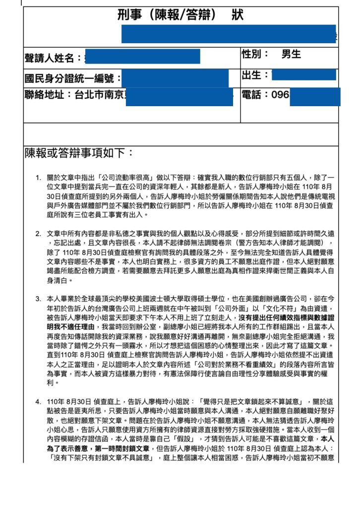 聽了王檢的話後,藍人回家後趕快 google 搜尋書面答辯狀,發現如果請律師寫需要幾萬塊,藍人只好自己動手將當天於偵查庭上來不及辯駁之內容一一書寫下來,並且於隔日寄給王檢。全文連結在此