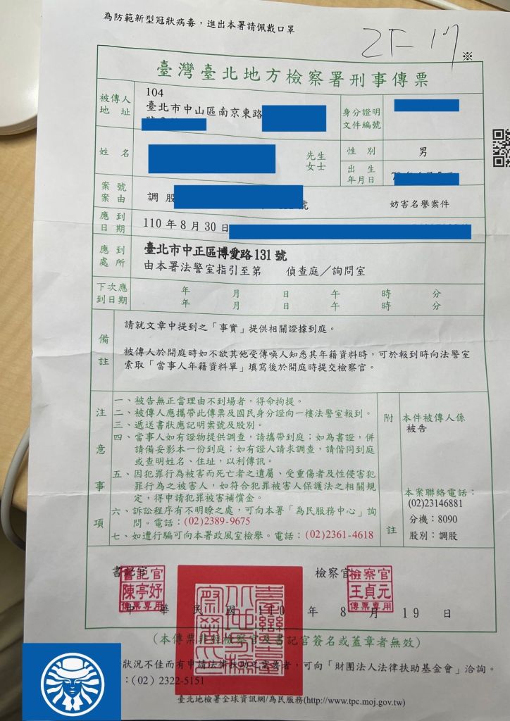 做完筆錄之後,藍人的心情就很糟糕,雖說在美國出庭當過證人,但在自己國家成為被告,真的非常鬱悶,每天都會不時的查收信箱,後來才知道地檢署的傳票是用掛號的,而我也終於在 8月底收到了地檢署的傳票。